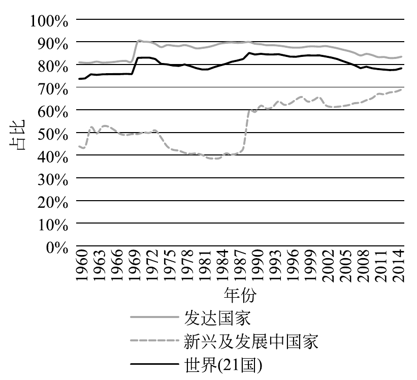 | 图1 发达国家、发展中国家、世界总体(21国)GDP分别占世界全部高收入国家、中低收入国家和全部国家GDP的比例 |