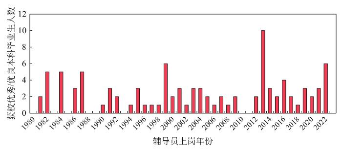 学业优秀、科研能力强是辅导员树立威信的根本基础,有利于辅导员发挥榜样育人的作用,同时也是辅导员得以学有余力从容开展工作的必要条件。清华大学党委学生部的调研结果显示,2016—2022年辅导员群体中本科成绩排名在年级前1/3的平均占比为68.5%,2022年在岗辅导员中获得过清华大学优秀/优良毕业生的比例为35.3%。相比之下,院系是思想政治教育和教育教学的一线,在选拔辅导员时会更加注重学业和科研。如图3所示,1980—2022年清华大学C系历年上岗辅导员中共计97人获得过这两项荣誉,占比62.2%。