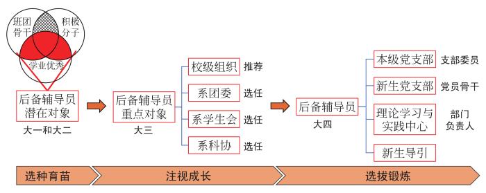 在“选种育苗”阶段(大一、大二年级),带班辅导员从学业优良的班团骨干或入党积极分子中有意识地挑选后备辅导员潜在对象,帮助他们做好生涯规划,鼓励他们突出特色、全面发展。在“注视成长”阶段(大三年级),学生组推进后备辅导员重点对象的发展入党工作,选任或推荐他们到院系和校学生组织中担任核心骨干,并持续关注、关心重点对象的成长动态。在“选拔锻炼”阶段(大四年级),选拔出后备辅导员,统筹安排他们担任本年级党支部的支部委员、新生年级党支部的党员骨干或系理论学习与实践中心的部门负责人,以提升后备辅导员的党建工作能力,并加强院系的本科生党建工作。后备辅导员还会担任新生导引计划志愿者,在协助新生辅导员的同时也达到跟岗锻炼的目的。在这种培养机制下,C系的后备辅导员人数一般多于岗位需求量,可以实现差额选拔、优中选优的目标。学生组还会根据个人实际情况和意愿,推荐未上岗的后备辅导员到学校其他学生工作部门担任辅导员,由此既可以加强校系学生工作系统的联动,也能建立起院系学生工作队伍的人才池。若高校从全体研究生中选拔“双肩挑”辅导员,则可在入学前或第一学期对有意向担任辅导员但本科毕业于其他高校的研究生进行集中培训。