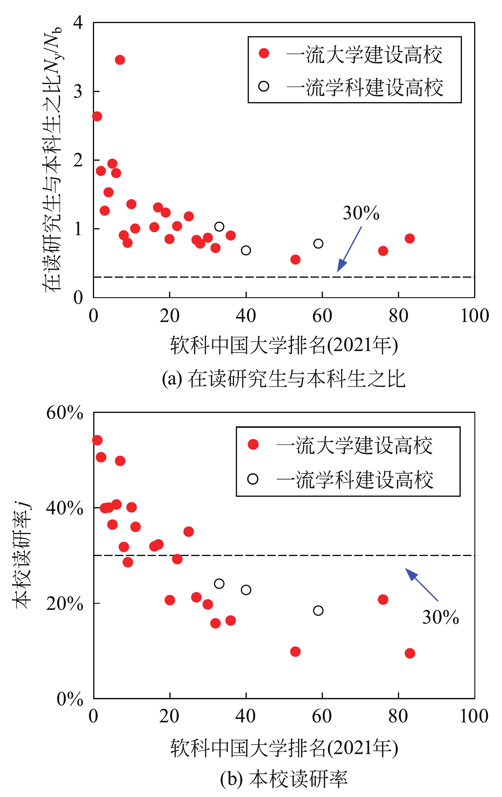 | 图1 部分“双一流”建设高校的在读学生结构和本校读研率(2021年) |